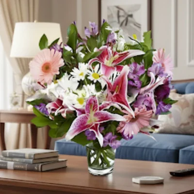 Este impresionante bouquet fusiona la suavidad de las gerberas rosadas y la inocencia de las margaritas blancas con la majestuosidad de los liliums fucsia y la elegancia sutil de las alstroemerias moradas. Dispuesto artísticamente en un jarrón de cristal, su composición visual ofrece una sinfonía cromática que aporta vitalidad y sofisticación a cualquier espacio. Ideal para embellecer un living elegante, su presencia es una declaración de buen gusto, ofreciendo un impacto estético inmediato y una sensación de frescura perdurable.
