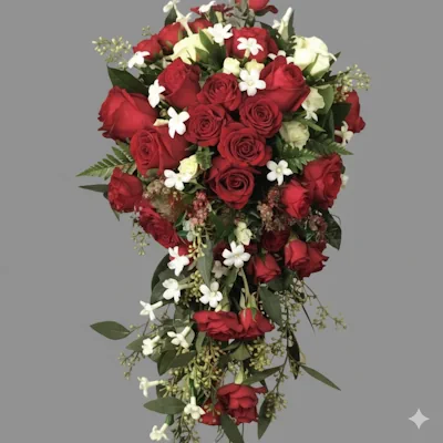 Este impresionante ramo en cascada se distingue por la riqueza de sus rosas rojas, que descienden con gracia y elegancia. Entre el vibrante color carmesí, se intercalan delicadas flores blancas, que aportan puntos de luz y contraste, junto a un exuberante follaje verde que enmarca la composición. El diseño fluido y alargado de la cascada crea una silueta dinámica y sofisticada. Estéticamente, este ramo es una declaración de pasión y romance, ideal para eventos que requieren una presencia impactante y memorable.