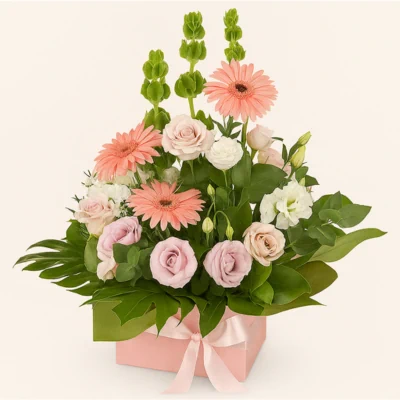 Una composición floral que celebra la delicadeza y la frescura con una paleta de rosas suaves, gerberas vibrantes y lisianthus blancos, enmarcados por follajes verdes que aportan profundidad y textura. El diseño se presenta en una caja cuadrada rosa pastel con lazo de satén, ideal para regalar o decorar espacios con elegancia. Las flores se disponen en niveles que generan movimiento visual, mientras los tallos verticales aportan estructura y altura. Cada elemento está cuidadosamente equilibrado para transmitir armonía, dulzura y sofisticación. Perfecto para ocasiones especiales, homenajes o como pieza decorativa que transforma cualquier ambiente.