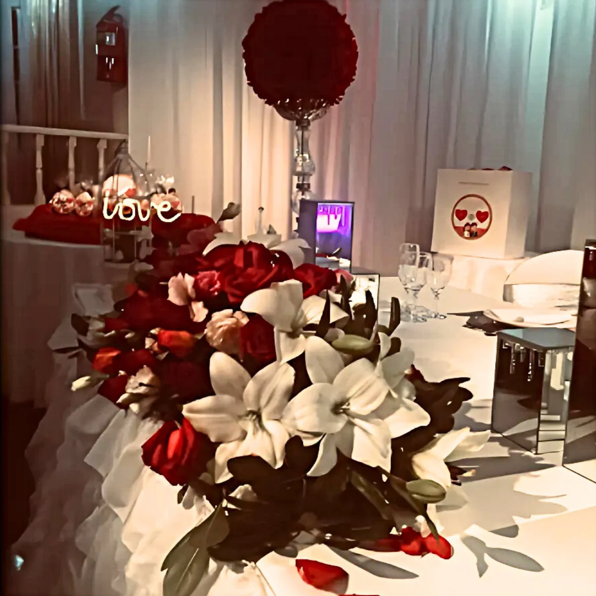 Una propuesta decorativa pensada para eventos que celebran el amor con estilo. Esta mesa principal combina un arreglo floral de rosas rojas y lirios blancos con elementos decorativos que refuerzan la atmósfera romántica: cristalería brillante, cortinas vaporosas con luces cálidas, detalles en rojo y un cartel que expresa “love” con delicadeza. La composición está diseñada para generar impacto visual desde el primer momento, ideal para bodas, aniversarios, cenas temáticas o celebraciones íntimas. El equilibrio entre color, textura y luz crea una escenografía envolvente, perfecta para fotografías memorables y experiencias únicas.