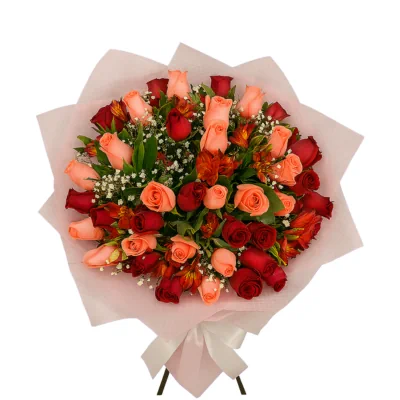 Ramo de rosas en tonos rosados y rojos, acompañado por alstroemerias naranja y blanco, gypsophila y follaje verde intenso. La composición es densa y envolvente, con flores en distintas etapas de apertura que aportan ritmo visual y profundidad. El envoltorio en papel rosa y lila con patrón sutil enmarca el conjunto con suavidad y elegancia. Este ramo está pensado para celebraciones, regalos afectivos o gestos de gratitud, combinando calidez cromática, textura delicada y presencia visual. Ideal para ocasiones especiales que requieren un detalle floral expresivo y sofisticado.