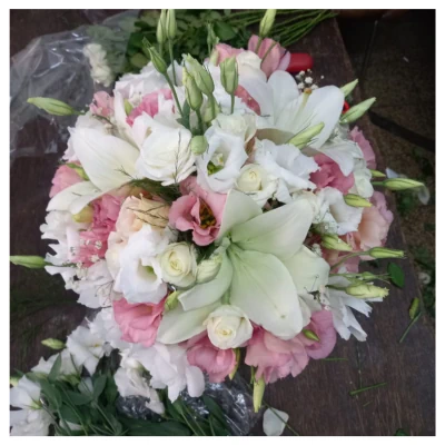 Un ramo floral elegante que combina lirios blancos, rosas en tonos suaves y delicados lisianthus rosados. La composición se organiza en un equilibrio armonioso de formas y colores, donde cada flor aporta textura y frescura. El diseño transmite pureza y romanticismo, con un toque contemporáneo que lo hace ideal para celebraciones, bodas o regalos significativos. La combinación de flores de tallo largo y pétalos aterciopelados otorga volumen y una estética refinada, pensada para destacar en cualquier ocasión especial.