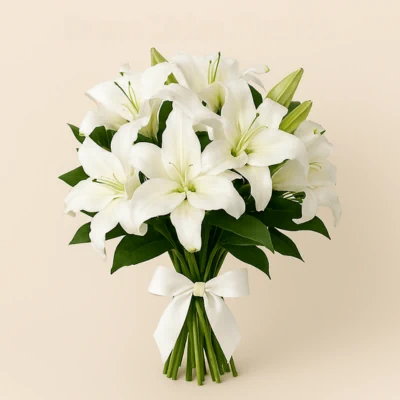 El Ramo Lirios Blancos reúne lirios asiáticos en plena floración, con pétalos blancos de textura suave y forma acampanada, acompañados por follaje verde brillante que aporta contraste y profundidad. Los tallos largos y firmes se dejan ver a través de una envoltura transparente, realzando la naturalidad del conjunto. Un lazo blanco de satén enmarca la base del ramo, aportando un toque de elegancia sin interferir con la pureza visual de las flores. La composición vertical y abierta permite que cada flor respire y se luzca, generando una sensación de frescura, serenidad y sofisticación. Ideal para homenajes, celebraciones íntimas o espacios que buscan transmitir calma y belleza.
