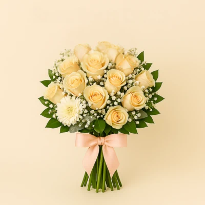 El Ramo Rosas Crema presenta una composición delicada y envolvente que combina rosas en tonos crema con acentos cálidos en el centro de cada flor. La disposición simétrica y cónica permite una lectura clara de cada variedad, mientras la gypsophila blanca aporta textura ligera y volumen sin saturar el conjunto. El follaje verde brillante enmarca las flores con contraste y frescura, y los tallos largos quedan expuestos en la base, unidos por un lazo satinado color durazno que complementa la paleta cromática con elegancia. Su diseño vertical y abierto lo convierte en una pieza versátil para celebraciones íntimas, regalos delicados o decoraciones que buscan transmitir serenidad y sofisticación.