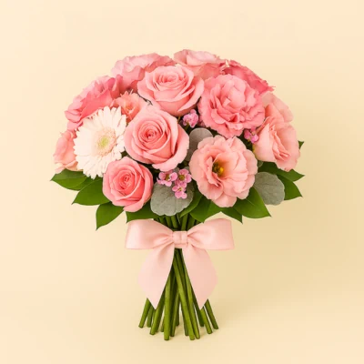 El Ramo Tono Rosa reúne una selección de flores en distintas gamas de rosa, combinando rosas pastel, gerberas blancas, lisianthus y follaje plateado en una composición envolvente, suave y armónica. Las flores se disponen en capas que alternan formas redondeadas y pétalos rizados, generando profundidad visual y textura sin perder equilibrio. El follaje verde brillante y los toques de dusty miller aportan contraste y frescura. Los tallos largos quedan expuestos en la base, unidos por un lazo satinado rosa que complementa la paleta cromática con delicadeza. Su estructura vertical y abierta permite una lectura clara de cada variedad, ideal para celebraciones íntimas, regalos delicados o decoraciones que buscan transmitir ternura y elegancia.