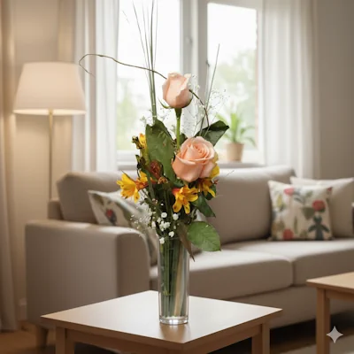 Este arreglo floral se distingue por la elegancia de dos rosas color durazno, que se elevan con gracia entre un despliegue de vibrantes flores amarillas y pequeños detalles de follaje. La composición vertical, realzada por elementos estilizados, se presenta en un jarrón de cristal alargado que permite que la luz realce su frescura. Ideal para complementar un living moderno o clásico, aporta un acento visual que transmite calidez y un sutil encanto natural. Su presencia armoniza con el entorno, ofreciendo una pieza decorativa que embellece sin saturar.